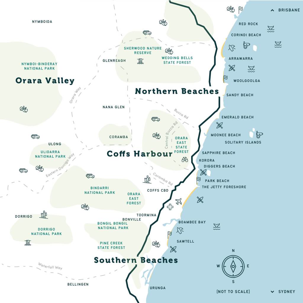 Highlights are; Boambee Creek, coastal heathland, Bonville Creek, Coffs Creek, Park Beach reserve, Coffs Harbours “Sydney Barbour Bridge”, Red Hill foothills and banana plantations, the 5 Red Hill tunnels and rural hinterland before terminating at the old Coramba railway precinct and returning to Coffs Harbour station.